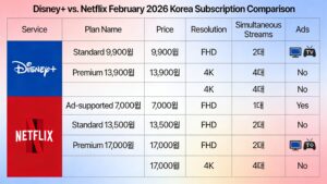 분석: 4K 초고화질과 4인 동시 접속이 가능한 프리미엄 요금제를 원한다면 디즈니+가 월 3,100원 더 저렴하여 경제적입니다. 하지만 광고를 보는 것이 크게 불편하지 않고, 최대한 저렴하게 이용하고 싶다면 넷플릭스의 광고형 요금제가 좋은 대안이 될 수 있습니다.